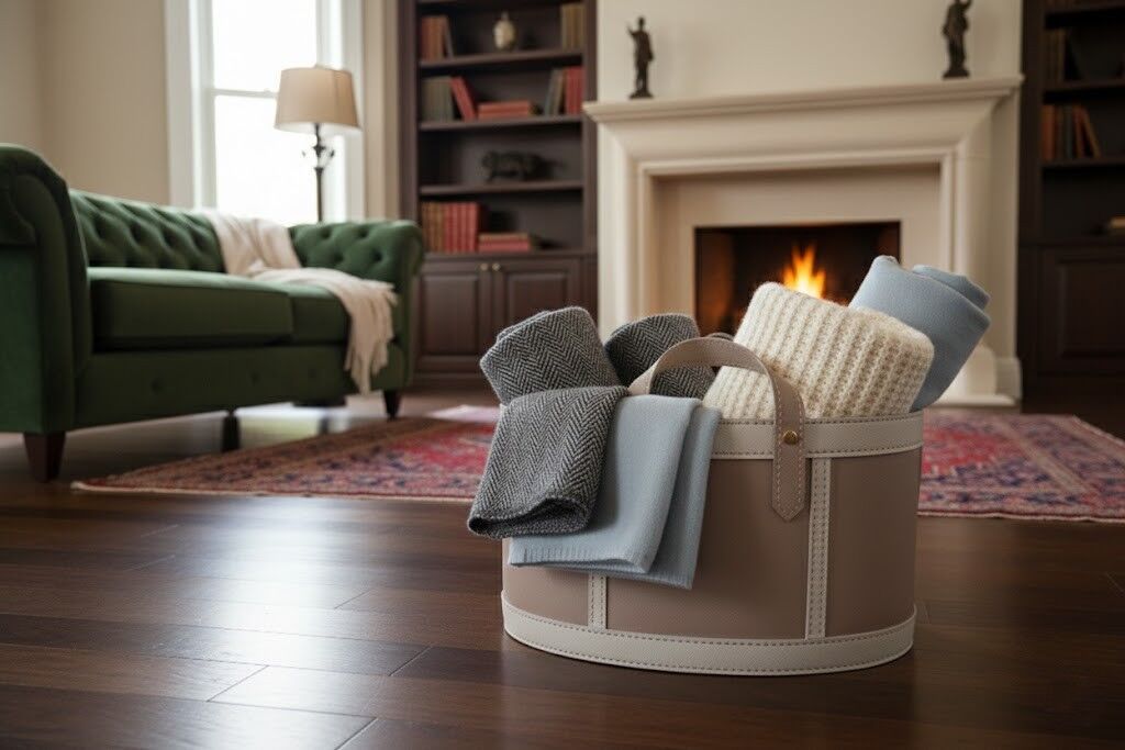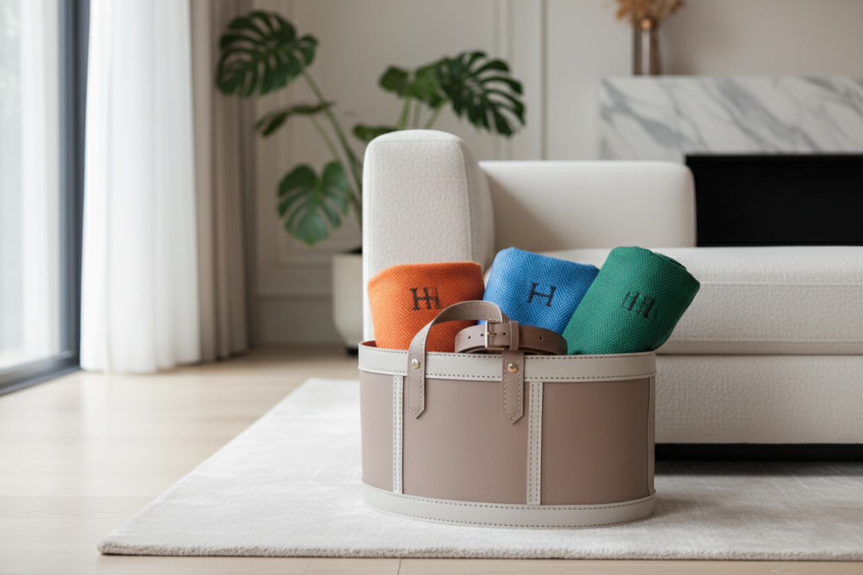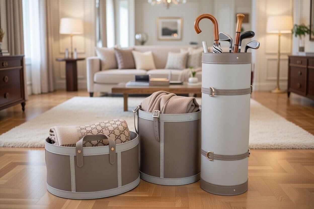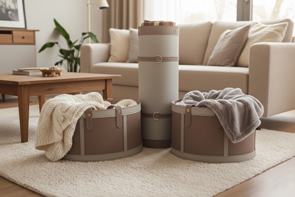 Yumuşak silindirik formu ve zarif deri detayları sayesinde salon, oturma alanı veya yatak odalarında sıcak ve sofistike bir atmosfer yaratır. Battaniye, yastık, tekstil ürünleri veya günlük eşyalar için şık bir saklama çözümüdür.